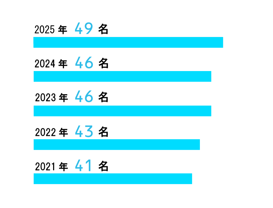 数字で見るTIS 社員の年代比率 社員数 全体49人 男性25人 女性24人 男女比率 5.1:4.9 平均年齢 35.6歳 社員数推移(各年4月1日現在) 平均有給取得日数 15.5日 (2024年度) 平均残業時間 15時間/月 (2024年度) 資本金 8,000万円 売上高 約22.2億円 (2024年度)